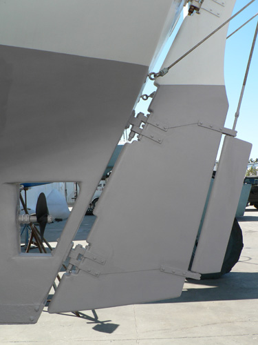 Port side view of Catspaw's rudder and trim tab