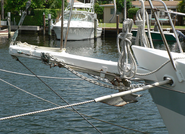 Catspaw's bowsprit, with twin working anchors