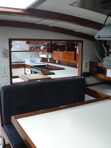 View across saloon dinette into galley
