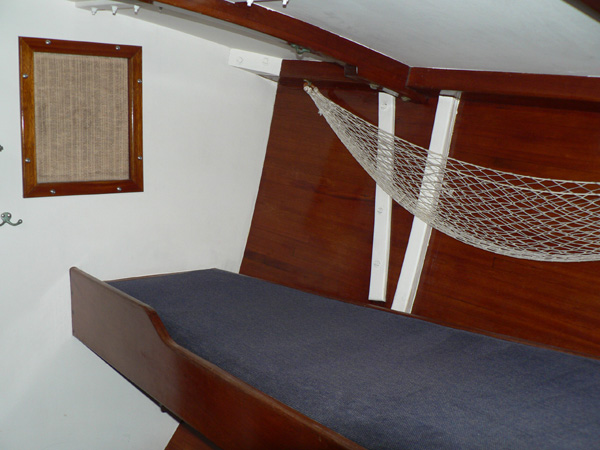 Starboard forward corner of saloon, showing foot of upper berth and cargo net