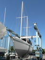 The current outboard is a 9.8 HP Nissan two-cycle outboard, weighing something like 65 lbs. It is about as heavy an engine as can conveniently be stowed in the forepeak and horsed around to mount on the inflatable. (We use a halyard to lower the outboard onto the inflatable.) Two-cycle outboards in this environmentally sensitive age are, unfortunately, a thing of the past. With this outboard (which is still in very good condition), the buyer has an opportunity to run a relatively high power-to-weight ratio outboard until it dies (hopefully a good long while), before being forced to go to a four-cycle replacement. (When that happens, he will probably have to choose between a considerably heavier engine with sufficient power to get the inflatable up on a plane and a less powerful engine that is at least light enough to horse around. Given this choice, I would probably give up the ability to plane the inflatable and opt for the lighter less powerful engine.)
