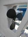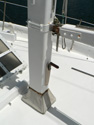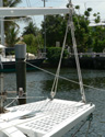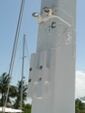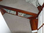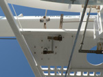 Somewhat forward of the skylight, the mainmast rises from the aft end of the forepeak. The boot arrangement for the mainmast is identical to that for the mizzenmast. Two relict panels, originally intended to support kerosene running lights, are mounted in the standing rigging port and starboard of the mainmast. Currently, these panels serve two purposes. They provide a lower point of attachment for the flag halyards that run up to the outer ends of the spreaders, and they provide a convenient (on deck) mount for Catspaw's Nissan outboard (for the inflatable).