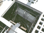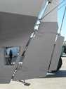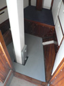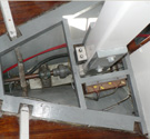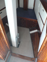 Access to and from Catspaw's interior from and to the cockpit is provided by the sliding main hatch at the aft end of the deckhouse roof (on the starboard side). Immediately beneath this hatch is a ladder leading to the galley below and, beneath this ladder, a duct connecting Catspaw's interior with the cockpit. The ladder folds up against the deckhouse roof to provide improved access to the duct, to the engine and battery compartments beneath the galley sole, and to components of Catspaw's refrigeration system, mounted on the aft bulkhead beneath the starboard counter.