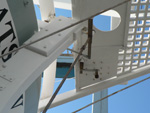 2) Single axis mode. In this mode, the wind vane is locked parallel to the vane assembly and rotates with this assembly. One gets to this mode by lining up the vane with the vane assembly and extending a single long pin down from the top plate (pinning both the shaft plate and the vane linkage plate). However, Catspaw must first be brought to the proper heading before extending the pin. Note that, in this mode, the angle of attack that the wind presents to the vane lessens as the drive shaft rotates. Accordingly, this mode is not as powerful as the dual axis mode. It is also more difficult to set up. In consequence, we have in fact used this mode very little.