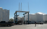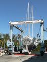 The Jolly Boat is launched by first lifting its bow above the bow mount, sliding it aft a few inches to disengage the pins on the transom mount, then lifting and turning it rightside up, resting it on top of the bits, attaching a harness to its three lifting eyes (two on the transom and one on the bow), attaching one of the jib halyards to the harness, and using the halyard to lift it clear of the lifeline and drop it into the water. This operation normally takes two people, one to lift the transom and handle the jib sheet and winch and one to lift the bow and guide the Jolly Boat overboard.
