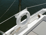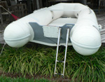 The inflatable has a vinyl rollup floor and fiberglass seat, and is rated for a 10 HP outboard. It has oversize tubes and will accomodate a large load (up to five adults). With 10 HP and only one or two people aboard, the inflatable will get up on a plane, but not with three or more. It makes an excellent snorkelling platform. We have equipped it with a telescoping stainless steel swimming ladder (mounted on the transom), so it is relatively easy to get aboard from the water (even for us older folks). This ladder bolts to a bracket permanently attached to the transom and is removed when storing the inflatable.