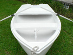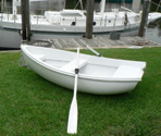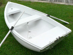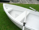 The fiberglass dinghy, an 8 ft Jolly Boat built in Fort Lauderdale in the mid 1970s by Brandon Manufacturing, rows nicely, will accept a 2 HP outboard, and has a very nice cat sailing rig. There are three builtin fiberglass seats (with sufficient floatation that the swamped dinghy will not sink), one immediately forward of the transom, one amidships over the centerboard trunk, and one just aft of the stem. The dinghy can be rowed from either of the seats forward. It is quite stable, even when heavily loaded. (We have occasionally had as many as four aboard, and have routinely carried three.)