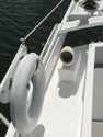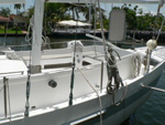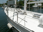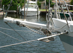 In addition, Catspaw's boomkin serves four functions that might be difficult to satisfy in other ways: 1) it allows full access to the mizzen boom, 2) it provides a suitable location for the wind vane steerer, 3) it provides a suitable platform from which to suspend a collapsible swimming ladder, and 4) it houses an auxilliary outdoor head (set in the hatch above the swimming ladder).