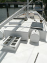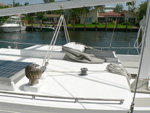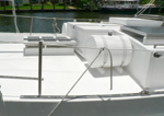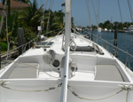 Between the forward end of the deckhouse and the skylight is a custom built deckbox, employed originally to hold our Crewsaver liferaft and more recently to hold a variety of deck gear. (We still have the liferaft, but have not carried it aboard since our return from around the world, because we felt that, in South Florida and the Bahamas, our emergency needs were adequately served by a handheld GPS, handheld VHF, and an inflatable. The deckbox is also fastened from below and can be removed to refinish it, the deck, and the forward side of the deckhouse.