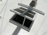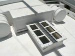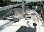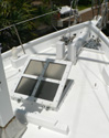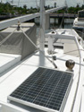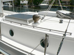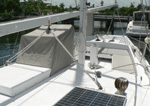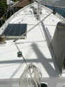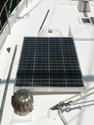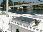 An 80 watt Kyocera solar panel sits on the port forward corner of the deckhouse roof. The location and attitude of this panel are not adjustable. At anchor or at the dock in the Bahamas and/or South Florida, this location and attitude normally charges the batteries at a substantial, if less than optimum, average rate. Under sail, the charge rate can be quite variable, depending on whether or not the sails shade the panel. This simple installation is, however, quite robust and does not need tending. (Catspaw has two additional flexible panels that can be tied in the rigging as desired to provide additional charging.)