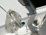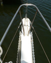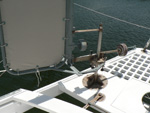 A fiberglass tray for the anchor chains straddles the bowsprit, forward of the bow mount for the Jolly Boat. The chains run through chocks at the forward end of the bulwark to the rollers on the bowsprit and back to the stowed anchors. Retaining clips from the bits keep the chains from running out throught the chocks.The bitter end of both anchor lines is attached to the bits, from which the lines run back and forth along the bulwark to the chains. When deployed, the anchor lines are belayed to cleats built into the bulwark just aft of the chocks. A section of hose prevents the anchor lines from chafing on the chocks and/or rollers. In this fashion, Catspaw's ground tackle is kept completely above the main deck.