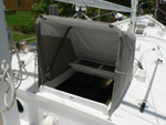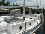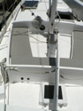 The sliding main hatch is at the aft end of the deckhouse on the starboard side. The hatch slides into a fiberglass box that discourages spray from finding its way below. An acryllic dodger, attached to this box and extending aft over the hatch, also discourages spray and rain from directly entering the open hatch. This dodger collapses forward to ease the access below when the dodger is not needed. (One can quite readily negotiate this access when the dodger is up, but it is a tight fit, as the main boom has to clear the top of the dodger.)