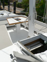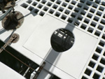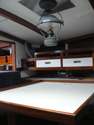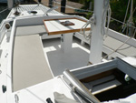 A low cushion-covered bench runs along the inside of the cockpit (port, starboard, and aft). Just forward of the aft section of this bench is a control post for the engine. The throttle control is on the port side of this post, and the transmission control is on starboard side. At the top of the post is Catspaw's Ritchie Navigator compass. A removable formica cockpit table (edged with a varnished Philippine mahogany keeper) cantilevers from the post.