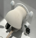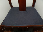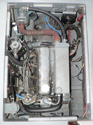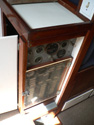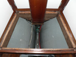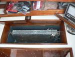 There are four components to Catspaw's pump organ, the keyboard and reed assembly (stored as described above), reservoir (in place beneath the dinette sole), foot pump (stored in the forepeak aft of the bits), and a 3 in diameter hose connecting the reservoir and keyboard (stored on the shelf under the port counter in the saloon). To assemble the pump organ, the keyboard must first be transferred to the dinette table, where it sits facing forward, locked into a PVC-lined hole in the table top. The hose connects the underside of this hole to one of two similar holes on top of the reservoir. The foot pump in turn rests on the dinette sole and locks into the other hole in the reservoir. (By sitting at the keyboard on the forward settee and activating the foot pump, one draws a vacuum in the reservoir, which in turn pulls air through the reed assembly.)