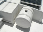Port and starboard of the deckbox are two 15 gal custom built clyindrical fiberglass tanks that can be used to store fluids in addition to the diesel fuel and water tanked below decks. In the past we have used these tanks for gasoline (for outboards and a small motor scooter) and kerosene (for the stove and cabin lights). These tanks are lashed in place on a pair of cradles outboard of the deckbox.