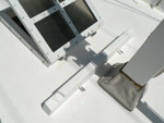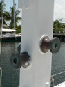 On the aft side of the deckhouse, just starboard of amidships, are mounted a series of connections between Catspaw's interior and the cockpit. These connections include a vent for the engine room blower, two overflow lines for Catspaw's water tanks, a hose fill for Catspaw's water tanks, a 120 VAC shore power connector, a 12 VDC battery power connector, and two cockpit speaker connectors. These connections are brought up from below via a vertical duct beneath the ladder at the aft end of the galley.