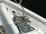 Catspaw normally anchors with one or two relatively light (25 lb) CQR anchors. These anchors hang from a simple custom stainless steel clip built into the underside of the bowsprit. This clip supports the shanks of the anchors, while the chain ends of these shanks are pulled forward to the rollers at the end of the bowsprit. The chains are then clipped tight inboard of the chocks, using keepers that run aft to the bits. Each of the anchor lines currently carries about 10 m of 3/8 in chain and 50 m of 5/8 in nylon line. The chains stow in a tray straddling the inboard bowsprit, and the lines flake fore and aft in the waterways along the forward bulwark. This system keeps the active ground tackle completely above deck. There is no chain locker (and no attendant moisture) below deck.