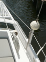 The over-the-mizzen-boom cockpit awning is similarly constructed, except that it is sewn from acryllic, uses the mizzen halyard to support the ridge of the awning, and employs a 1 1/2 in pole along its aft edge to spread the awning athwartships. The ridge is pulled tight between the mizzenmast and the end of the mizzenboom, using two lanyards attached to the center of the pole. One of these lanyards pulls the pole towards the end of the boom; the other attaches part way up on the topping lift (still attached to the end of the mizzen boom) and pulls the pole away from the boom. The forward corners of the awning are held in place by lanyards running to the mizzen stays. Tiedowns from the flaps and lanyards from the ends of the pole run to the lifelines, port and starboard.