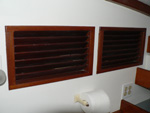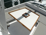 All hatches are two-layer trunk hatches, 1/2 in lexan over a Philippine mahogany base frame. The sliding main hatch runs on brass strap fastened to the hatch and to a Philippine mahogany trunk, set into the roof of the deckhouse. The opening hatches are hinged to Philippine mahogany trunks set into the main deck.