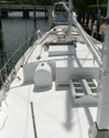 A third set of tracks, intended for a fourth light weather jib (ghoster) is attached to the aft several feet of the bulwark cap. We have this sail, built in the early 1970s, but we normally do not carry it along and have only very rarely deployed it. (Usually, when the wind is very light, it is also very unsteady, so one has to work very hard for very little reward. It is often better to simply sit and wait.)