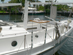 The entire main deck is surrounded by a substantial bulwark (that is a capped continuation of Catspaw's strip-planked skin) and by a jacketed stainless steel lifeline that runs from the bow pulpit to the aft end of the boomkin (port and starboard). The lifeline is supported by custom stainless steel stanchions, bolted to the inside of the bulwark. A taffrail above the transom bridges the bulwark at its aft end. Between the bulwark and outboard edge of the cockpit/deckhouse is a foot-wide waterway. The cockpit drains into this waterway through two decklevel cutouts at its forward end. The bulwark drains overboard through decklevel cutouts amidships (and also at times through the chocks set in the bulwark, particularly through the midships chocks. The deck has a substantial crown, so drainage is not a problem.