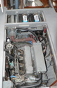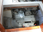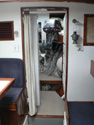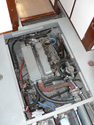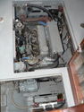 Catspaw's 4-cylinder diesel engine (Isuzu DL201, marinized as a Starrett 121D) is located amidships under the galley sole. It is accessed via a hatch in this sole, spanning the gap between two fiberglass fuel tanks built into and suspended from the sole. A second adjacent hatch covers a pair of 100 amp hr deep cycle storage batteries, suspended above the engine's Warner hydaulic transmission.