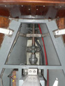 Catspaw's PVC electrical panel, by the stepdown from the galley to the saloon, is divided into three sections. The upper section contains various gauges and switches monitoring and controlling the engine and electrical system. The middle section is Catspaw's 120 VAC panel. The lower section is Catspaw's 12 VDC panel. All gauges, switches, and fuses are mounted on the starboard face of the panel. The lower sections are behind a clear plastic door that opens to starboard, allowing the underlying switches and fuses to be toggled and replaced from the stepdown. The corresponding electrical connections are made on the port face of this panel, accessible through the adjacent aft-opening cabinet door beneath the port counter.