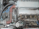Located on the starboard side of the engine are the injector pump, secondary fuel filter, oil filter, dipstick, raw water pump, and engine shutoff. On the port side are the alternator, starter motor, air intake, and exhaust manifold/heat exchanger. Originally, the fresh water fill for the engine was on top of the manifold. Following our trip around the world, this opening was welded shut and the fill moved to an auxilliary fresh water reservoir (on the aft bulkhead under the galley sink). This reservoir connects to the underside of the manifold; a bleeder valve in the welded cap allows one to purge air from the engine's fresh water system.