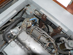 On the forward face of Catspaw's engine are its fresh water pump and thermostat. A three groove power takeoff on its driveshaft allows the engine to drive external devices mounted on a plate that bridges the two engine beds at their forward end. We currently use one of these grooves to drive our refrigeration system. In the past, we have used the other two grooves to occasionally drive an AutoGen 120 VAC generator. We have not used this generator in many years, but it can presumably still be mounted and made to work.