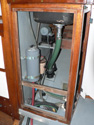 Further downstream is the system receiver, mounted on the aft bulkhead beneath the starboard counter (accessed via a pair of forward-facing cabinet doors). Outboard of the receiver is the control panel and, under the control panel, pressure gauges for the system's high and low sides. The high side line goes from the receiver to the dryer and sight glass (outboard of the control panel). From there it makes a turn forward and enters the icebox (where it connects with the expansion valve at the aft end of the holding tank). The pressure gauges and sight glass are both visible through a large opening in the (closed) outboard door beneath the counter.