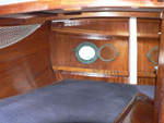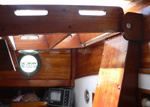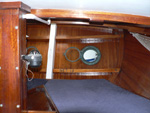 The opening ports are all Wilcox Crittenden 8 in bronze ports. Five of these are set into the sides of the deckhouse, two each on the port and starboard sides of this house and one on its aft side (communicating with the port side of the cockpit). The two remaining ports are set into the transom, above the berths in the aft stateroom. All ports open inboard and can be fixed in the open position.