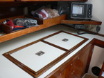 Outboard of the ladder, the counter wraps around and runs fore and aft to Catspaw's large chart table, which begins about halfway to the main bulkhead and wraps the counter back inboard along this bulkhead. Catspaw's icebox and holding plate are set into this counter between the chart table and the aft bulkhead. Two insulated lids flush with the countertop provide access to the toploading icebox. Two inboard-opening cabinet doors provide access to some additional storage space beneath the icebox (currently dedicated to Catspaw's life preservers).