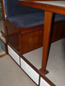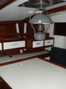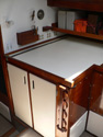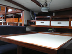 On the port side of this corridor, between a settee forward of the main bulkhead and a settee aft of the forward bulkhead, is a raised dinette. The settee cushions and backs are 4 in polyurethane foam. Outboard of the dinette is a formica counter, running fore and aft from bulkhead to bulkhead. The dinette's removable formica table locks into place inboard of the midddle section of this counter and is in turn supported at its inboard edge by a folding leg that indexes into the dinette sole. The table lowers between the tops of the settees to form a temporary double berth (with the settee backs cushioning the table top).