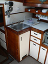 The counter on the port side begins aft with a forward facing stainless steel sink. Under the sink is a storage cabinet for dishwashing and other detergent supplies. This cabinet also provides access to two 3/4 in nylon seacocks for raw water in (to the engine and to the sink), to a 1 1/2 in nylon seacock for sink drain water out, and to Catspaw's Par Sea Puppy diaphragm bilge and sump pump, mounted above the water line and discharging through a fourth bronze thruhull at the waterline. (A series of inline plastic valves, accessible beneath the stepdown to the aft stateroom, control whether this pump connects to the bilge or to the sump beneath the shaft's inboard stuffing tube.) Two faucets, activated by Whale Babyfoot pumps beneath the cabinet door, pump fresh and salt water to the sink. The rectangular sink is large enough to hold a small plastic tub. There is room for a plastic dishbin and drain mat on the counter outboard of the sink. The dishbin, drain mat, and several tubs stow readily in the cabinet beneath the sink. Mounted on the aft side of the deckhouse trunk above the sink is a rack for Catspaw's aluminum tumblers.
