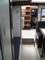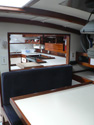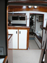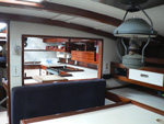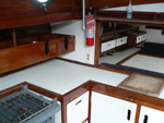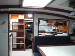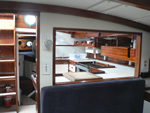 One enters the saloon from the galley by stepping down through an opening on the starboard side of the main bulkhead. An access corridor above the saloon sole runs from this opening to a similar opening on the starboard side of the forward bulkhead.