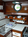 Catspaw's galley houses not only her galley and her engine and battery compartments, but her refrigeration system, her chart table and chart stowage, her electrical control panel, and, port and starboard of her engine compartment, two 60 gal fuel tanks. It also provides a large amount of storage space for galleyware, foodstuffs, and other items.