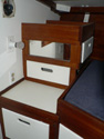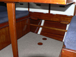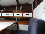 Beneath the settees and raised dinette sole are a series of four drawers that open to starboard into the corridor above the saloon sole. Built into the dinette sole, outboard of the middle drawers, is the receiver module for Catspaw's pump organ. Significant additional bin storage, accessed from above by removing the seat cushions and support panels, is found inside the settees above the fore and aft drawers.