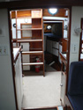 Beneath the counter is a storage shelf and, above the counter, a bookshelf, both of which run from bulkhead to bulkhead. Four inboard-opening cabinet doors under the counter provide access to the storage shelf. Built into the bookshelf are a wine rack (outboard of the books), four inboard-opening shallow drawers (under the bookshelf), two for cassettes (amidships) and two for paper (forward), a pen and pencil tray (forward), and a radio/DVD player module (under the drawers amidships).