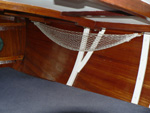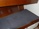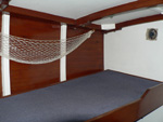 On the starboard side of the corridor, running fore and aft from bulkhead to bulkhead, are two saloon berths (4 in polyurethane foam over plywood). The lower berth fronts on the access corridor; the upper berth is set back from this corridor. Beneath the lower berth are a series of four additional drawers that open into the corridor to port. A cargo net suspended from the clamp above the upper berth provides additional clothes storage. The keyboard for the pump organ is stored against Catspaw's outer skin between the upper and lower bunks.