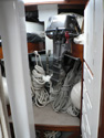 One enters the forepeak from the saloon by stepping up through an opening on the starboard side of the forward bulkhead, past the mainmast. Further forward, one steps up again to a triangular second level that ends at the support post for the bits. Stored under the lower level of the forepeak sole are a substantial length of 3/8 in galvanized storm chain (never deployed), several shorter lengths of chain, two comealongs, and some loose inside ballast. Stored under the forward level is a 45 lb CQR storm anchor and a substantial length of 5/8 in nylon line.