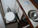 The toilet, a bronze Wilcox Crittenden Junior 51 toilet, is mounted on a module that locks into place just forward of the bulkhead. The nylon seacocks for the head (3/4 in water in and 1 1/2 in waste out) are accessible through a cutout on the starboard face of this module. Both lines are fitted with anti syphon vents above the water line. The pump handle is fore and aft along the outboard edge of the module (on the right, facing aft).