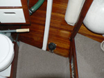 Several feet aft of the mizzenmast is the control post that leads the engine controls from cockpit to engine room. Forward of this post is a small removable trapezoidal settee, beneath which is a clothes hamper. This seat provides both a place to sit down in the aft stateroom and a step up into either berth. It also provides access to the aft end of the shaft, its inboard stuffing tube, and the sump beneath this stuffing tube. This stuffing tube can be tightened or loosened from above using a pair of special wrenches, and grease can be forced into the cavity between the inboard and outboard stuffing tubes (through a grease fitting integrated into the body of the inboard stuffing tube). (Normally, the drip from the inboard stuffing tube can be completely stopped by introducing more grease. This is useful when Catspaw has to be left alone for an extended period of time.)