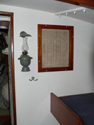 At its forward end, the port counter wraps around and runs along the main bulkhead, ending amidships in Catspaw's starboard-facing electrical panel. Two aft-facing cabinet doors under this section of the counter provide access to the back side of this panel and to a series of upper and lower storage bins. A large opening in the main bulkhead above this section of the counter allows one to readily pass food and dishes through to and from the saloon dinette and contributes substantially to the openness of Catspaw's below decks layout. Above this opening, facing aft, is a spicerack. Mounted on the forward side of the deckhouse trunk amidships are the ship's barometer and clock.
