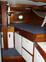 Tucked under the main deck above the outboard edge of the starboard counter is an additional shelf (divided into a series of bins) for storing various navigational gear. Catspaw's Sitex recording fathometer and Icom VHF radio are mounted on a small addon to this shelf at its aft end.